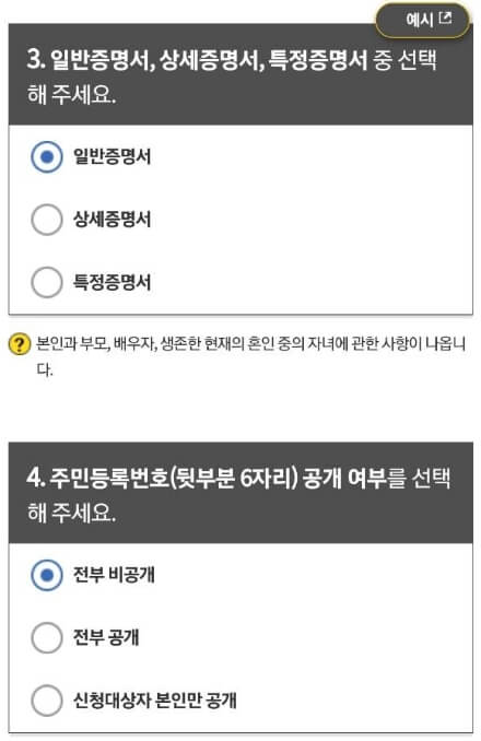 - 발급 신청 단계에서 필요한 증명서의 종류(일반/상세/특정)를 선택합니다.